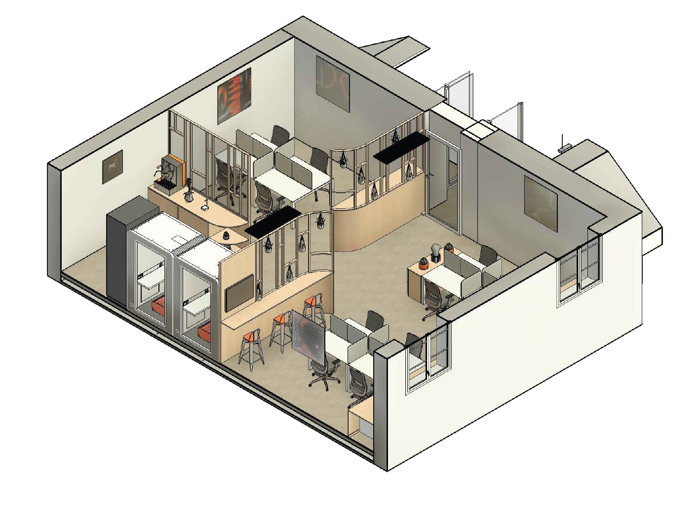 Axonométrie de la partie Open Space du bureau